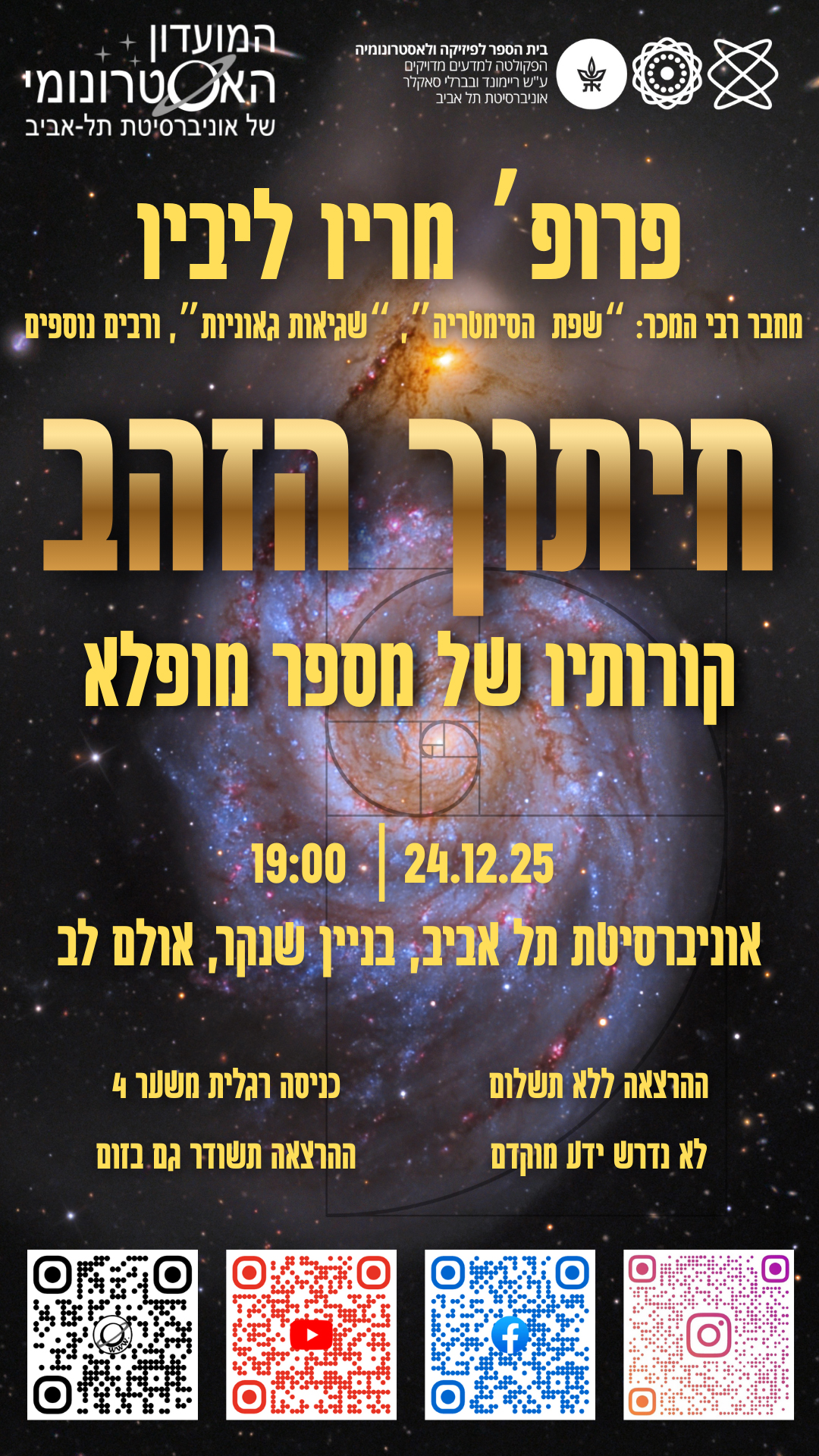 בהרצאה זו, האסטרופיזיקאי ומחבר רבי המכר, פרופ’ מריו ליביו, יספר לנו על מספר מיוחד זה, המופיע שוב ושוב סביבינו.